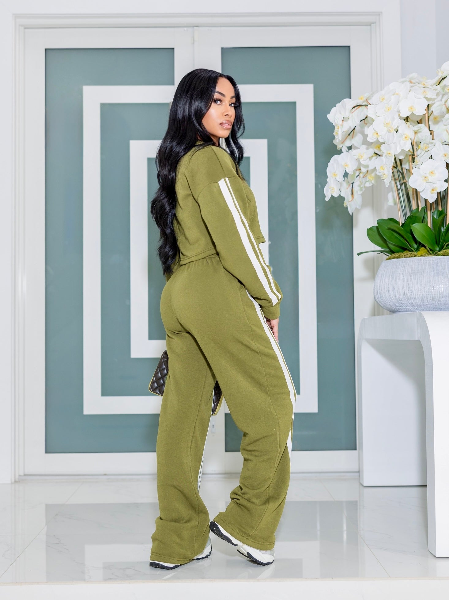 A sleek two piece jogger set designed for effortless style and comfort. The cropped long sleeve top highlights the waist while the high rise jogger offers a relaxed, elongating fit. Soft stretch fabric and clean side detailing make it perfect for everyday wear, travel, or elevated off duty looks.